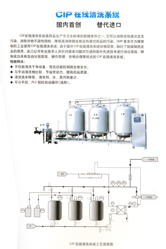 生物制药企业生产中,尤其是在药液配制系统中,会使用配料罐等各种储罐,而每个储罐和部件都需要在线清洗和消毒,以满足制药无菌要求;在线清洗/在线灭菌系统,主要作用是进行清洗液配制,并且把清洗剂溶液和注射用水以及纯蒸汽等通过不同的管道分别供应到各个储罐,可以对单个储罐或单个系统进行单独清洗和灭菌。在线清洗/在线灭菌系统,主要包括清洗液配制、循环冲洗和系统灭菌等主要模块和功能。系统内清洗剂储罐内的清洗剂溶液通过供液泵打入热交换器升温,目的是提高清洗效果,被加热的清洗剂接至需要清洗储罐,通过喷淋球对储罐清洗,并且溶液经过储罐出口,接至系统内自吸泵入口,通过自吸泵把储罐内清洗剂溶液打回入清洗剂储罐,形成清洗循环回路;再把供液泵的入口切换至注射水对储罐进行冲洗,形成冲洗通路,并且边冲洗边排放,直至冲洗合格;最后把纯蒸汽引入,通过冲洗通路进行在线灭菌。